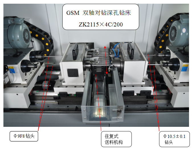1. 機床結(jié)構(gòu)的選擇:因為φ9f8 (+0.013-0.035)孔徑公差要求非常高,又加之零件為大批量生產(chǎn),效率要求極高,所以深孔加工過程需要穩(wěn)定可靠,并且要方便刀具及工裝的調(diào)整。所以,機床的主軸數(shù)量選擇為2軸。如果選用4軸機床,則同時調(diào)整4支高精度的刀具,難度很大,也很難保證加工質(zhì)量。為了提高加工效率,考慮將左側(cè)的φ10.5±0.1深孔與φ9f8 (+0.013-0.035)同時加工。這樣可以保證工件一次裝夾,完成左右兩側(cè)孔的加工,大大提高了加工效率,加工效率比通常的四軸機床還要高很多。所以機床選擇為雙軸對鉆深孔鉆床。加工孔徑范圍:φ3~φ15。機床結(jié)構(gòu)參見下圖。